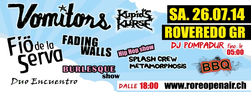 Ad esibirsi durante la serata ci saranno le seguenti band: Vomitors (CH), Fiö de la Serva (I), Fading Walls (CH), Duo Encuentro (CH) e Kupid's Kurse (CH).